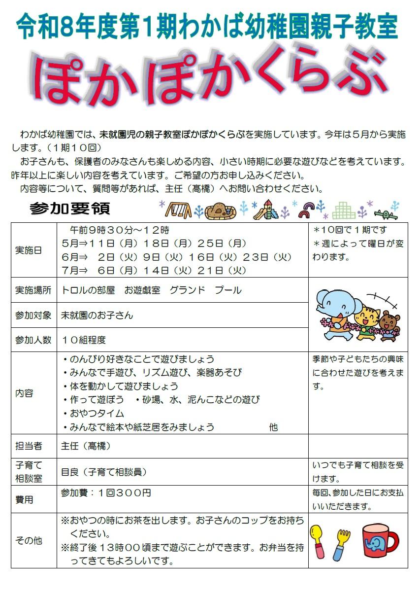親子教室「ぽかぽかくらぶ」第1期の案内です